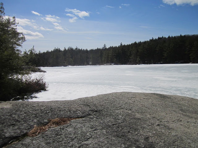 What with me eating like no tomarra, I took it upon meself to do a bit of a walk. It being a fine day with sunshine and the like, I tought it only fitting to attach a picnic to that fine walk ... it being nigh on springtime. I was choosing Kilburn Pond on which to set me feet wit it having a fine boulder by the pond most appealing for laying about in the sun and reading and such.